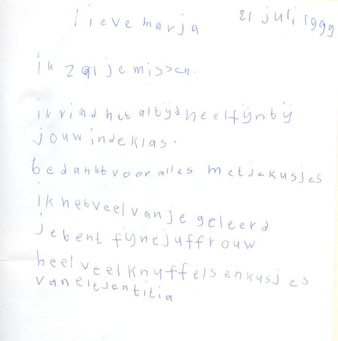 Op onze laatste schooldag samen besprak ik de rapporten met de leerlingen en had ik voor de leerlingen die afscheid namen een toespraakje voorbereid. Toen ik Eltjen toesprak, vertelde ik dat wij zeven jaar samen in dezelfde groep(en) waren geweest dat hij, toen ik hem voor het eerst zag, een heel klein ventje was, dat nog niet goed kon praten, lezen, rekenen, zwemmen, maar dat hij nu een grote kerel was die heel veel kon en daarom naar een andere groep mocht. Aanvankelijk keek hij me lachend aan, even later boog hij zijn hoofd. Ik dacht:” Wat reageert hij vreemd” , maar ineens zag ik druppels op de grond vallen. Het werd een emotioneel afscheid Titia, Eltjen en ik, alledrie in tranen.